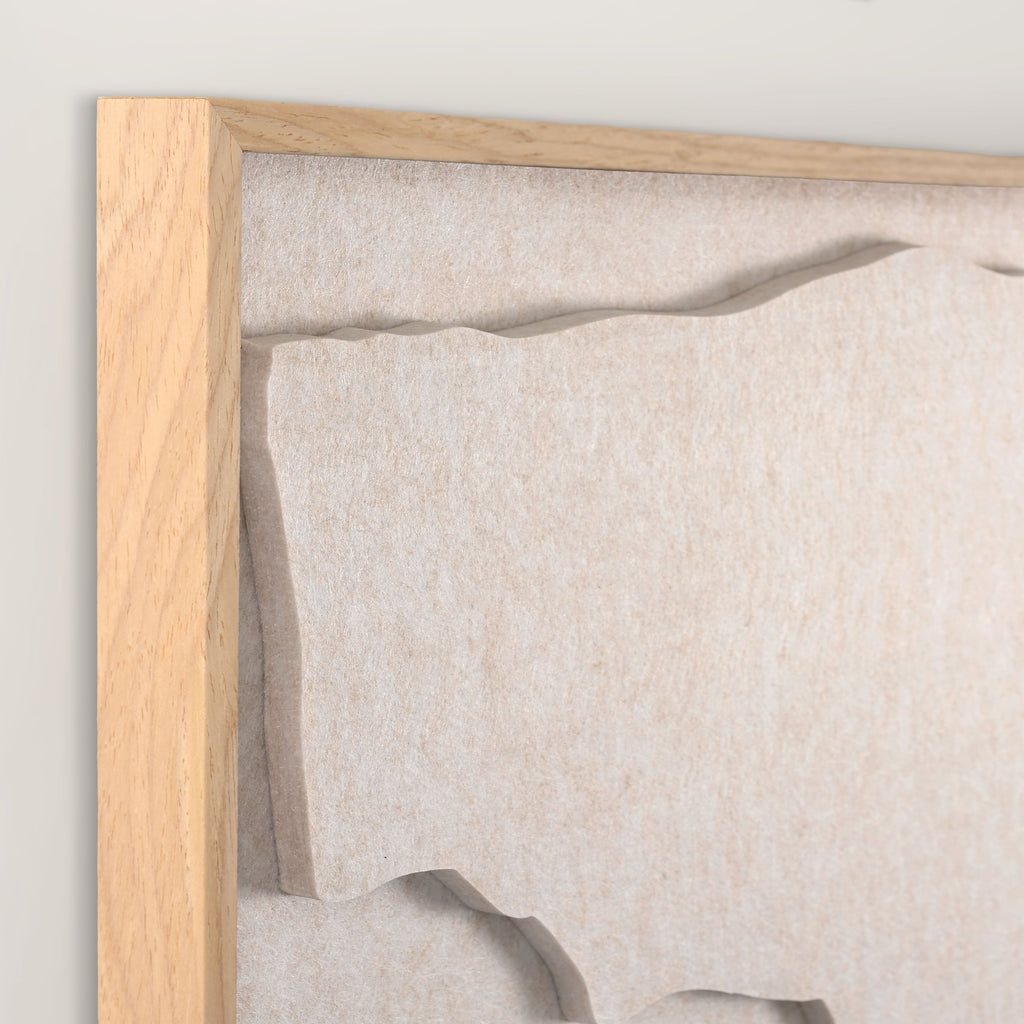 ACOUSTIC ART er lavet af hundrede procent genanvendt filt og indrammet i FSC-certificeret egetræ. Rammen har indgraveret ophæng på alle sider, så du kan hænge værket præcis i den retning, du ønsker. Det er dansk design, der skaber balance mellem form, funktion og følelse og giver dig kunst, som skaber ro.