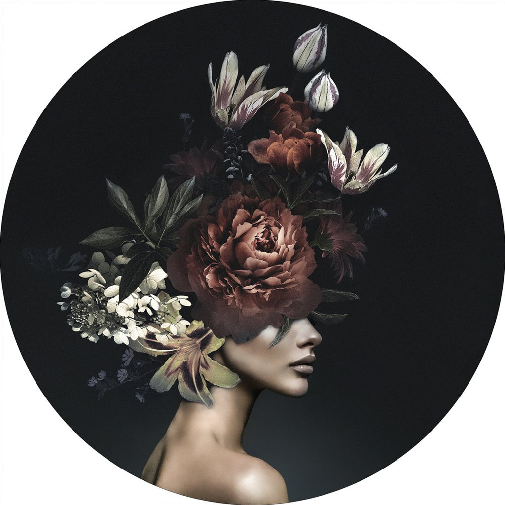 Grafisk kunstmotiv forestillende kvinde i silhouet, prydet med blomster i rødlige og lyse farver på en mørk baggrund. Motivet er næsten ikonisk og rummer stor appeal, så er du ude efter noget særligt og med stor blikfang, er dette motiv et rigtig godt bud. Flot alene, men også perfekt i kombination med andre blomstermotiver. Værket er tegnet af Art Copenhagens kunstner og grafiker Moritz.