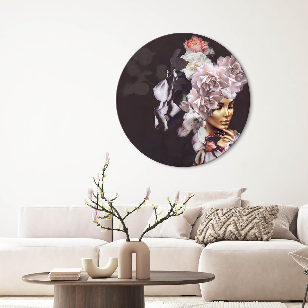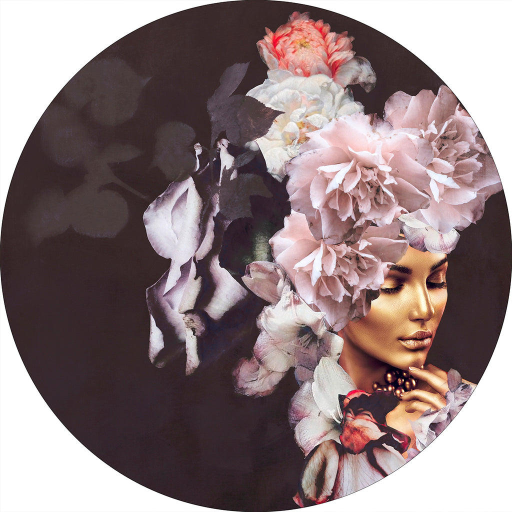 Unikt kunstdesign forestillende gylden kvinde på bourdeaux baggrund, flankeret af store blomster i rosa toner. Motivet har en ikonisk udstråling og vil skabe blikfang og Wauv effekt, der hvor det placeres. Et blomstrende og fortryllende udtryk, som vil stå stærkt i indretningen. Værket er designet af Art Copenhagens kunstner Freja.