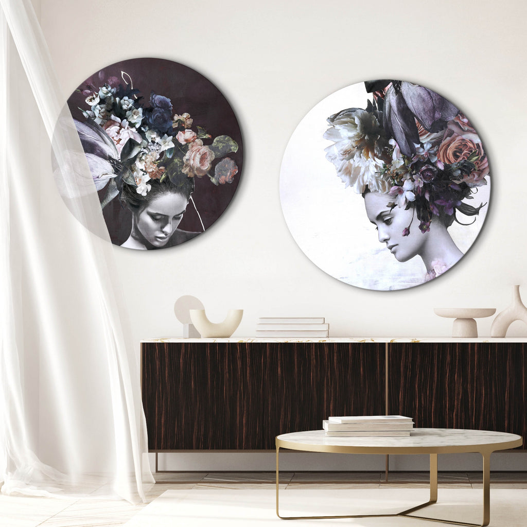 Sort/hvid foto af kvinde på lys baggrund med blomster i rødlige og lilla nuancer. Den kunstneriske udførelse og eventyrlige udstråling gør motivet både ikonisk og dekorativt på samme tid. Motivet er en del af "Haute Couture" kollektionen fra Frejas blomstrende univers. Værket er designet af Art Copenhagens kunstner Freja.
