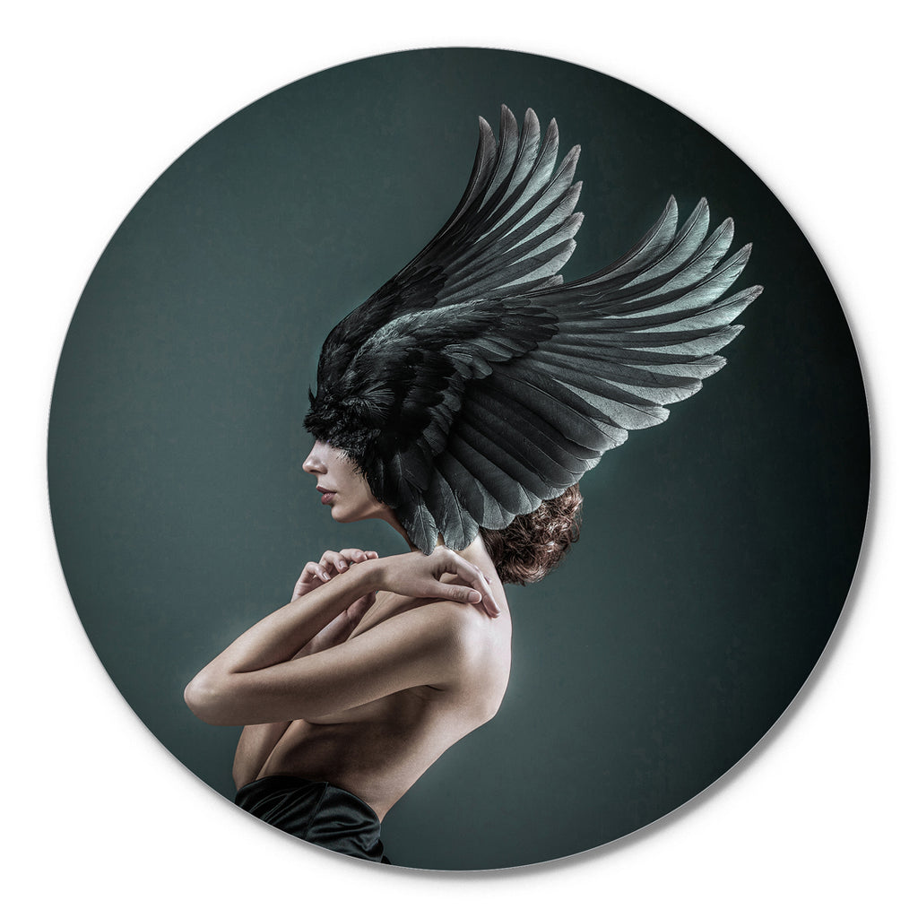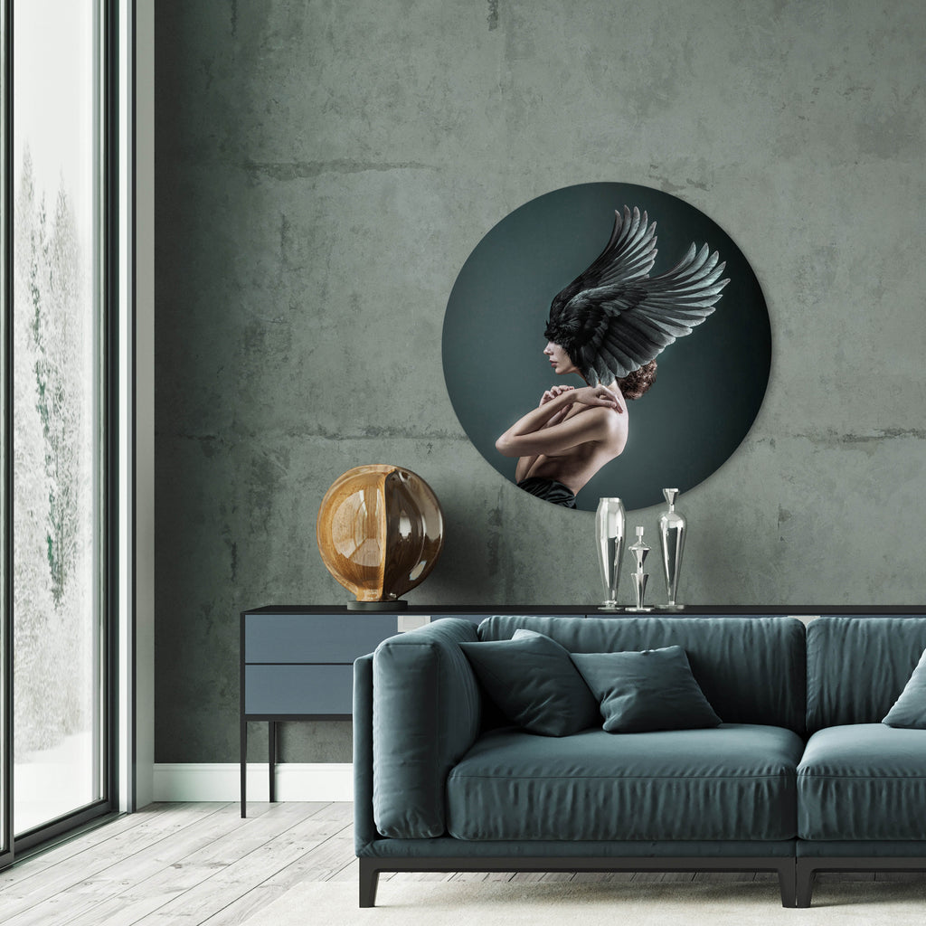 Smuk kvinde fra siden på mørkegrøn baggrund med ansigtet delvist dækket af udstrakte grønlige vinger. Markant og næsten mytisk billede, som vil skabe blikfang og understrege din personlige stil. Perfekt at matche med "Thea". Værket er designet af Art Copenhagens kunstner og grafiker Moritz.