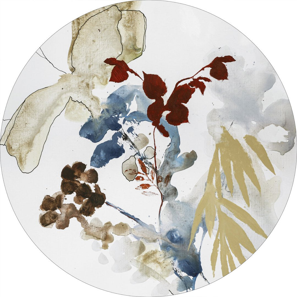 Blomstermotiv i kunstnerisk stil med blomster og blade i gyldne, røde og blå nuancer på en hvid baggrund. Motivet er udført i en let og poetisk stil i imødekommende farver, så det er nemt at placere i hjemmet. Brug det til at understrege den nordiske og - eller kunstneriske stil og giv det gerne selskab af Weightless 1. Værket er designet af Art Copenhagens kunstner Freja.