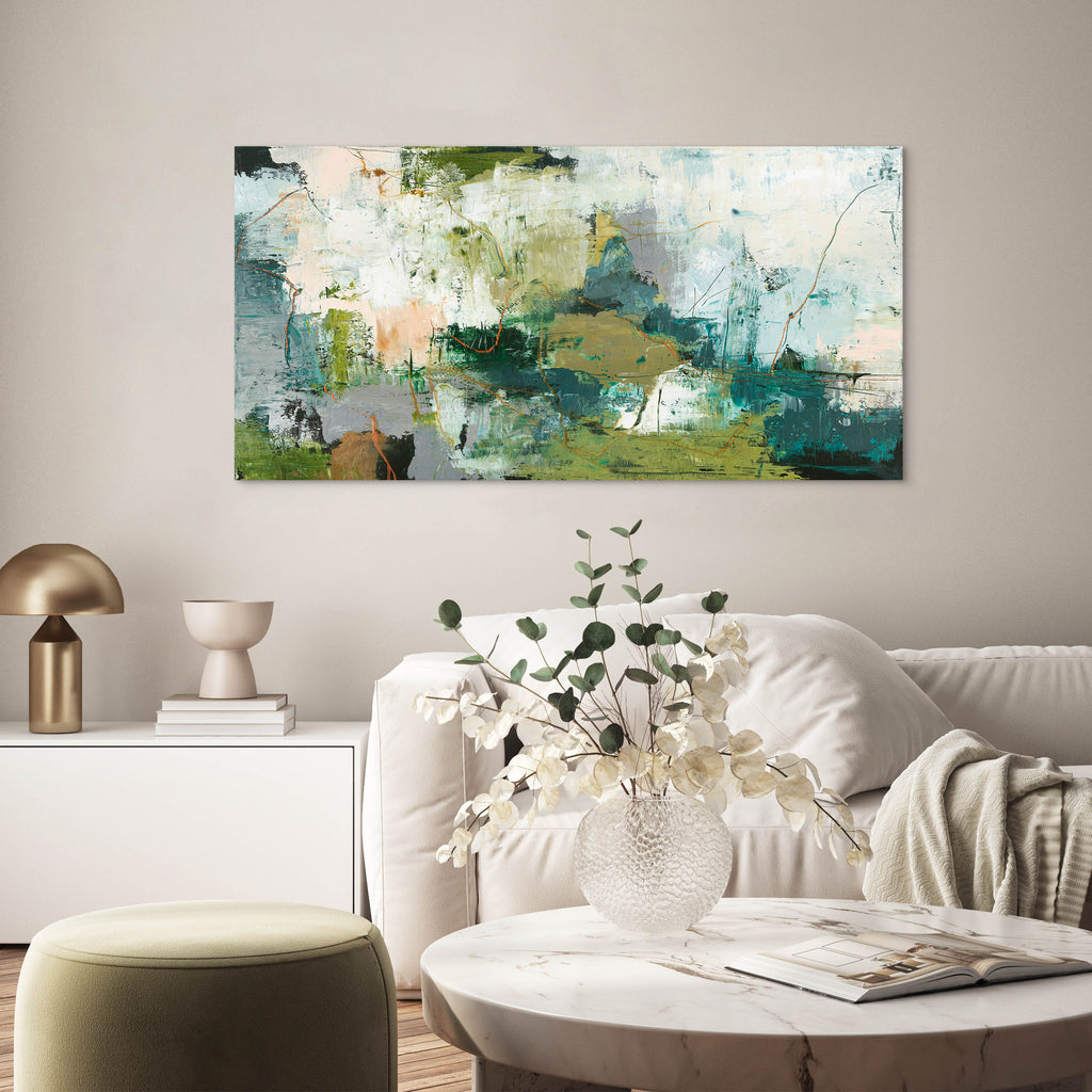 Liv og grønne farver dominerer dette maleri, som man virkelig kan gå på opdagelse i, og er en fryd for øjet, at se på. Stilen er rå, men med et imødekommende og positivt udtryk. Sæt focus på naturens farver eller opgrader din indretning med dette abstrakte maleri.