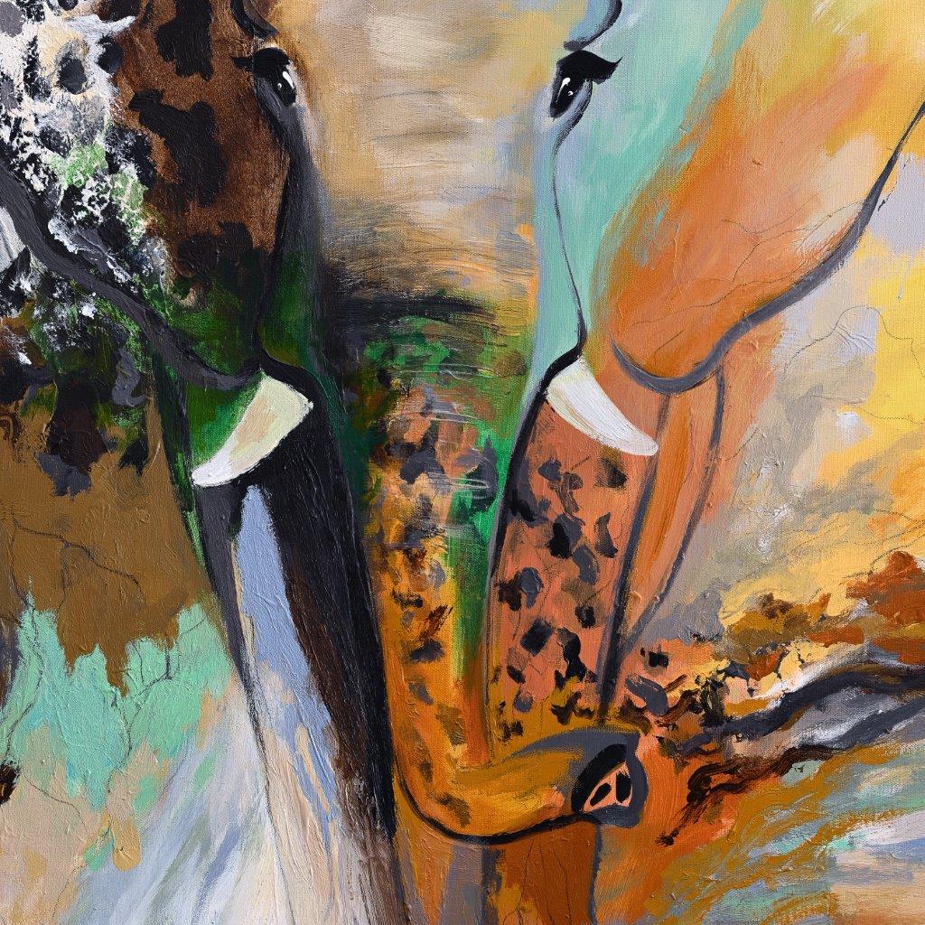 Ikonisk og farverigt elefant maleri i Gades typiske stil; majestætisk med store øjne og flotte harmoniske farver.