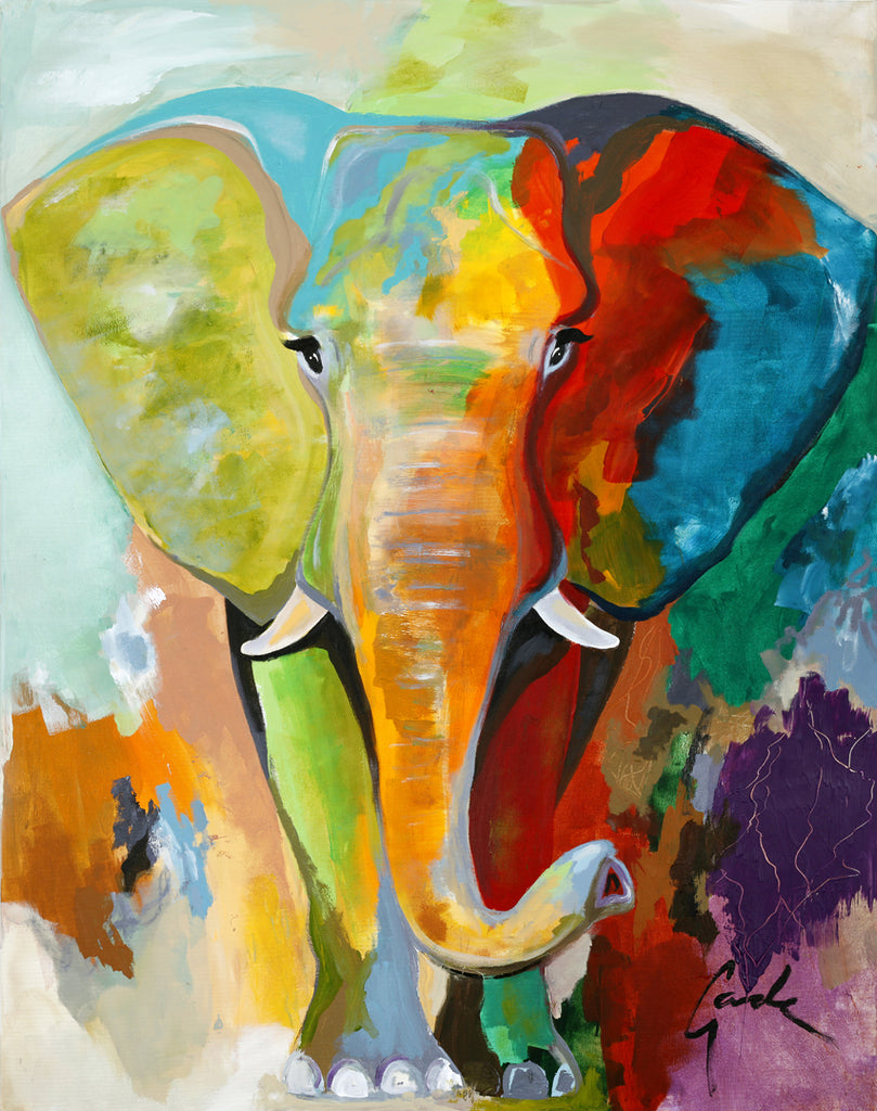 Ikonisk og farverigt elefant maleri i Gades typiske stil; majestætisk med store øjne og flotte harmoniske farver.