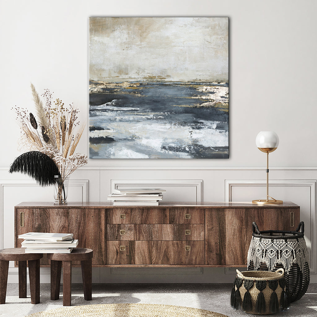 Enkelt effektfuldt maleri i støvet gråblå med guld og sand. Motivet er abstrakt, med en harmonisk udstråling, men kan også sagtens opleves som et landskabsmotiv, med hav og himmel.
