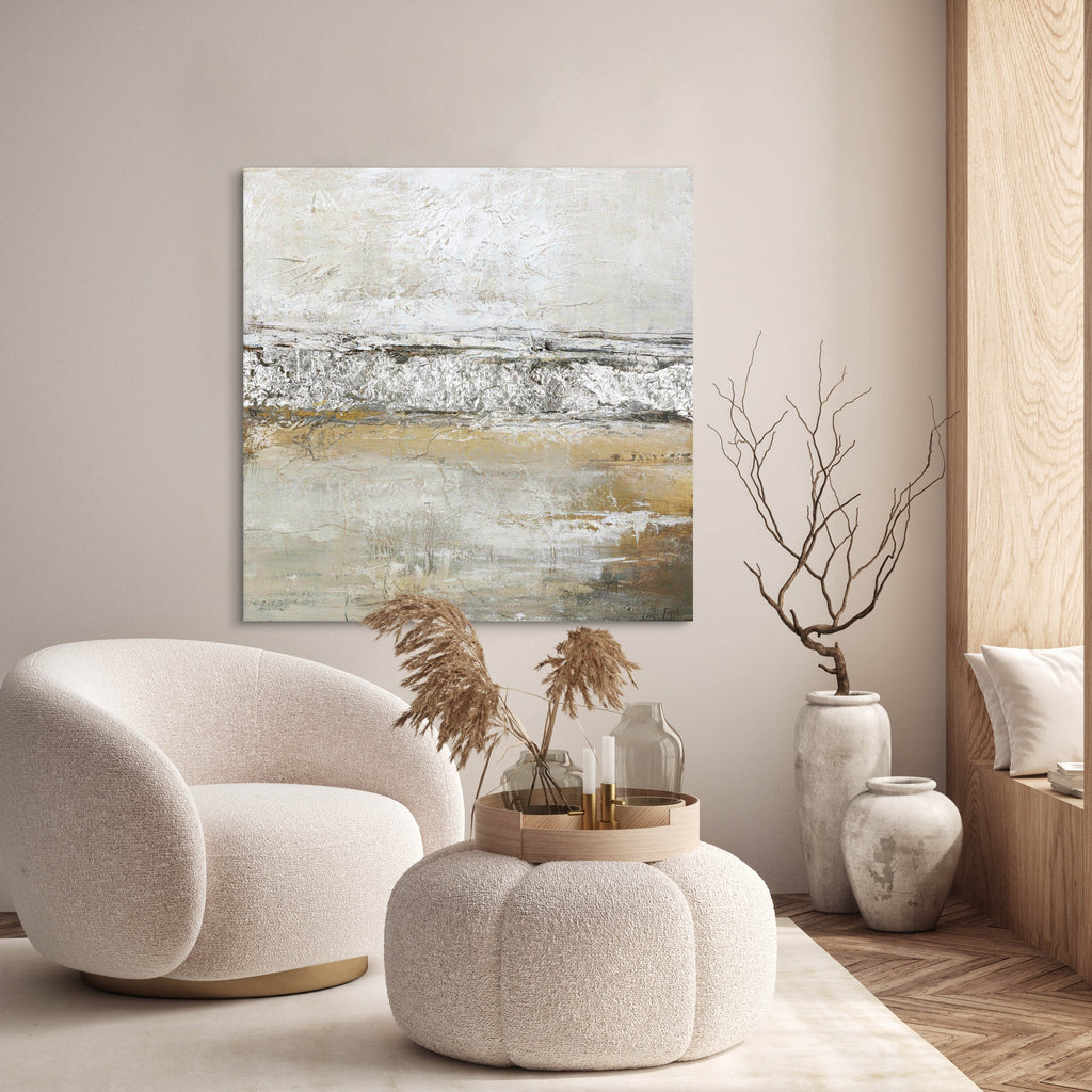 Enkelt maleri med struktur og sølv i lyse, natur og sandfarver. Moderne og klassisk udtryk i en populær stil med horisontal linje og afstemte farver. Flot både til at underbygge en naturlig stil, men også til at yde kontrast til en minimalistisk stil. Passer perfekt sammen med Low Limit Gold.