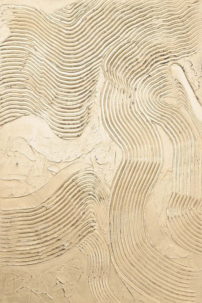"Metallic Champagne" er et abstrakt værk med strukturerede linjer og en champagnefarvet metallisk overflade, der giver masser af shine og tilføjer elegance til ethvert rum.