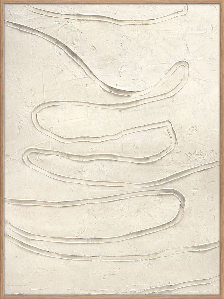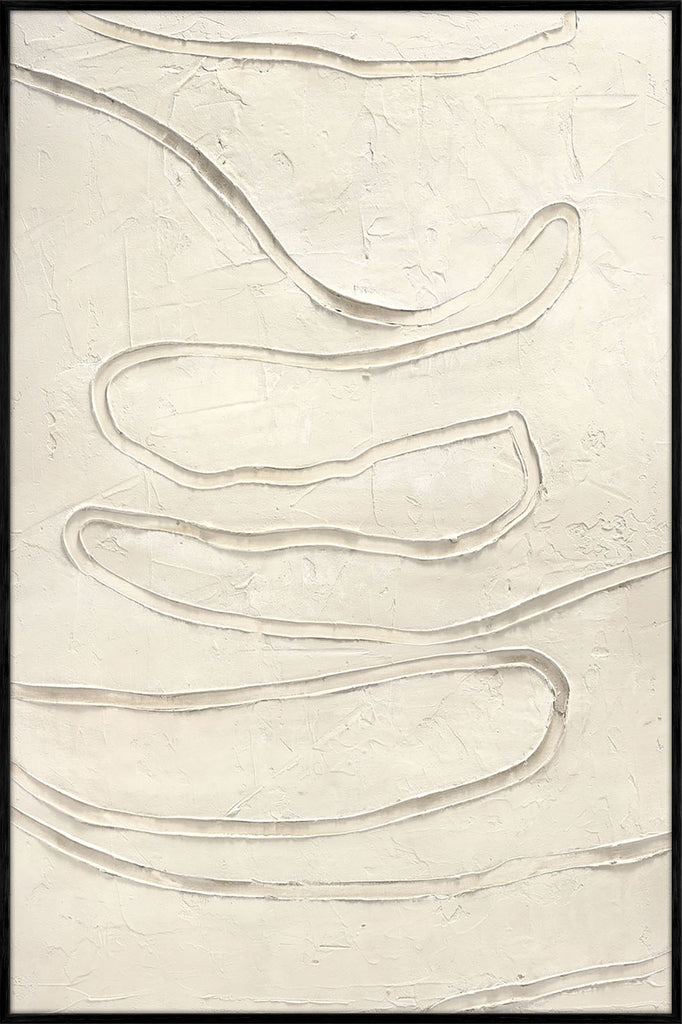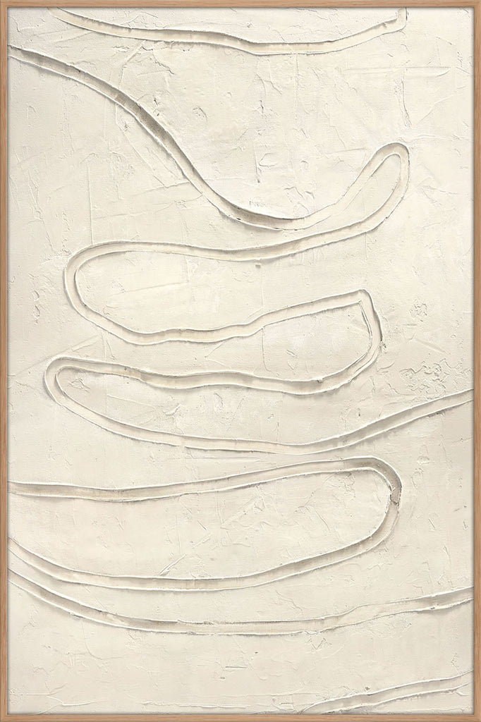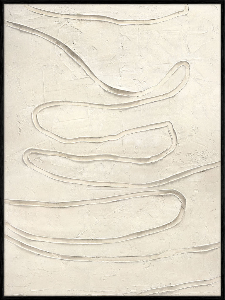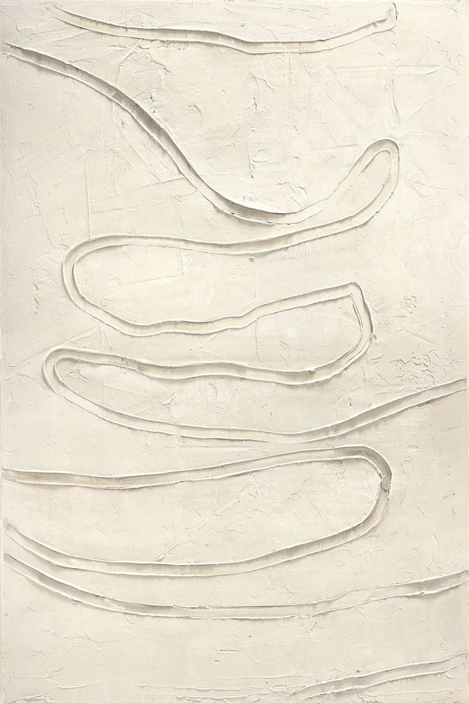 "Track The Line" er et abstrakt maleri i lyse neutrale toner med bøjlede linjer og tekstur, der skaber en moderne og beroligende atmosfære.