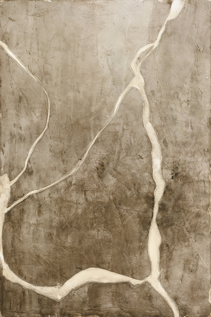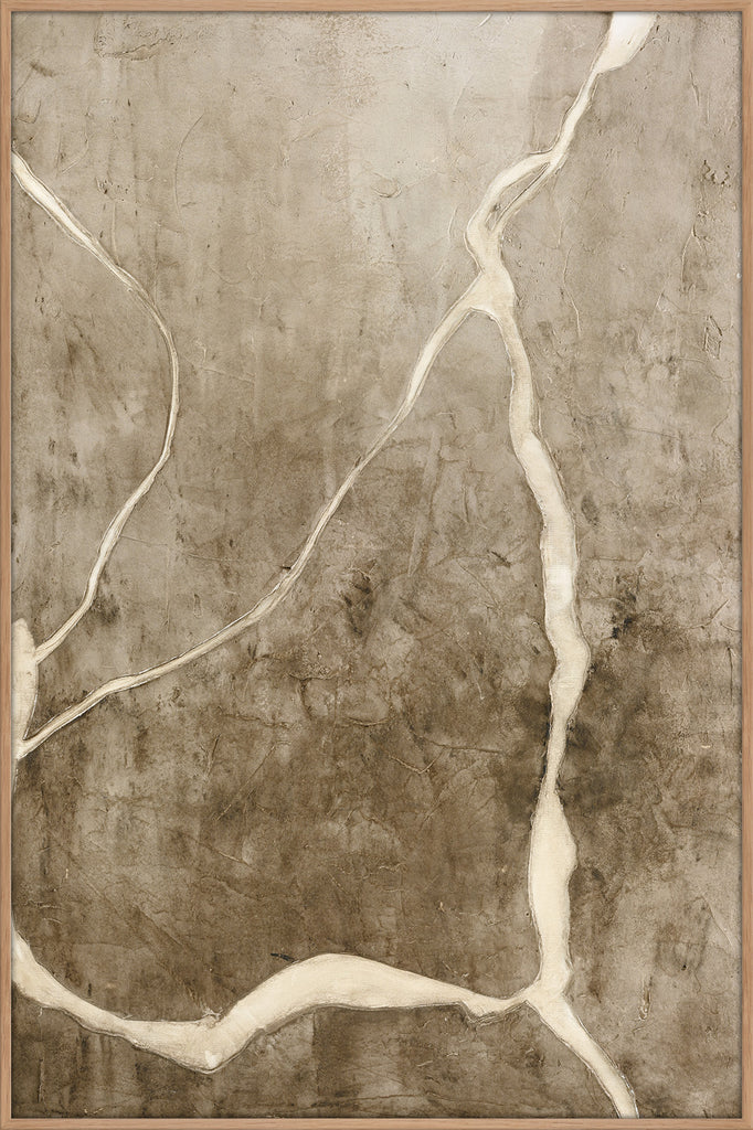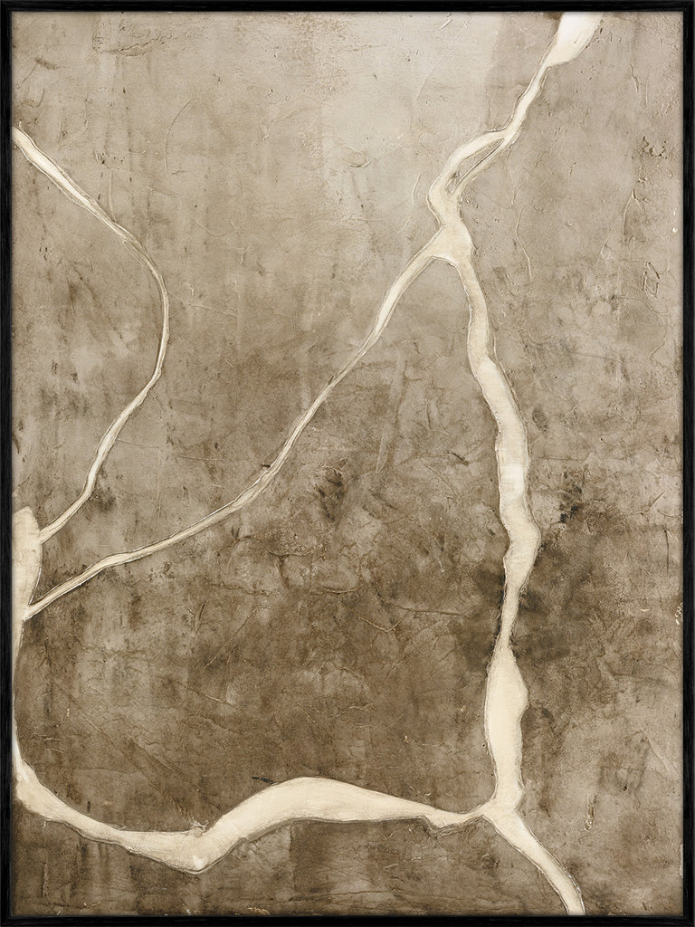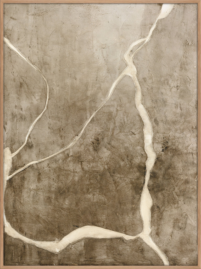 Vibranium' er et abstrakt maleri med naturlige nuancer og organiske revner, der skaber et naturligt og råt udtryk. Perfekt til at tilføje atmosfære og dybde.